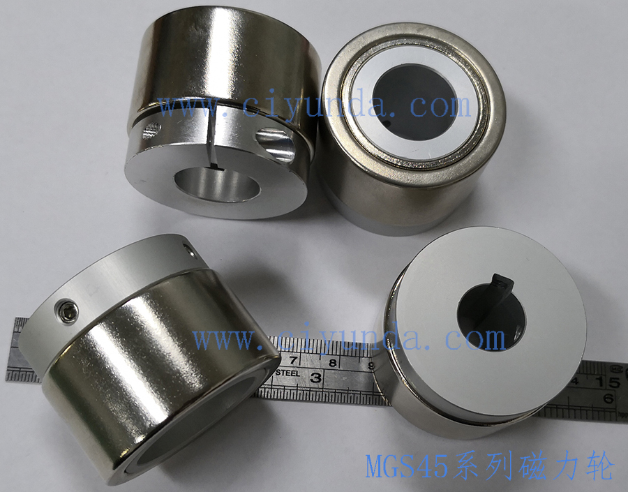 外徑45mm。是目前我公司外徑最大的直角傳動磁力輪,這個規(guī)格我們是燒結(jié)的,表面鍍鎳,10級充磁,常備內(nèi)孔有30mm、25mm、20mm、15mm,其他內(nèi)孔的也可以根據(jù)客戶的定做。這個規(guī)格是傳動方式為直角,如果間隙1mm時,傳動扭矩為1.2N.m。固定方式有頂絲固定和夾緊固定,目前有常備庫存。型號為:MGS4510P-20AC、MGS4510P-15AC、MGS4510P-25AC等